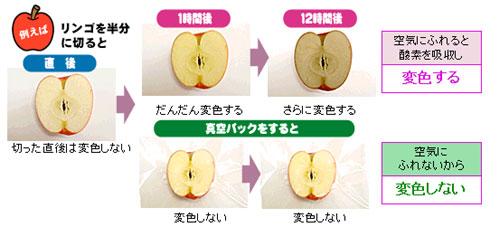 例えば、切った「りんご」をそのままに放置しておくと、色素が酸素と化学反応を起こし、 段々と変色してきます。この現象を「酸化」と言います。
